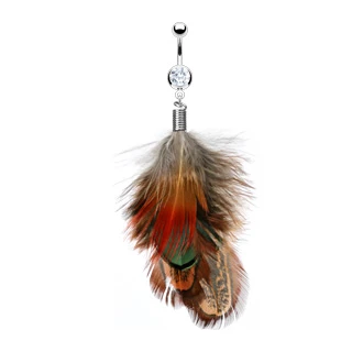 Piercing do pupíku. Dřík piercingu má rozměr 1,6*10mm, průměr vrchní kuličky 5mm, průměr spodní kuličky s kamínkem 8mm. Piercing je zdobený barevným peřím. Délka ozdoby cca. 75mm, šířka ozdobného peří cca. 45mm. Velmi netradiční piercing do pupiku se kterým jistě zaujmete.