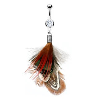 Piercing do pupíku. Dřík piercingu má rozměr 1,6*10mm, průměr vrchní kuličky 5mm, průměr spodní kuličky s kamínkem 8mm. Piercing je zdobený barevným peřím. Délka ozdoby cca. 60mm, šířka ozdobného peří cca. 40mm. Velmi netradiční piercing do pupiku se kterým jistě zaujmete.