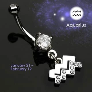 Piercing do pupíku se znamením vodnáře. Dřík piercingu je z chirurgické oceli 316L. Ozdoba piercingu je obecný porodiovaný kov. Piercing je ozdobený zirkony. Rozměry piercingu: 1,6*10mm, rozměry ozdoby 7*12mm.