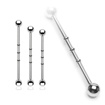 Piercing z chirurgické oceli 316L. Piercing do ucha . Dřík piercingu má průměr 1,6mm. Prstence na dříku mají průměr 2,5mm. Kuličky mají průměr 5mm.