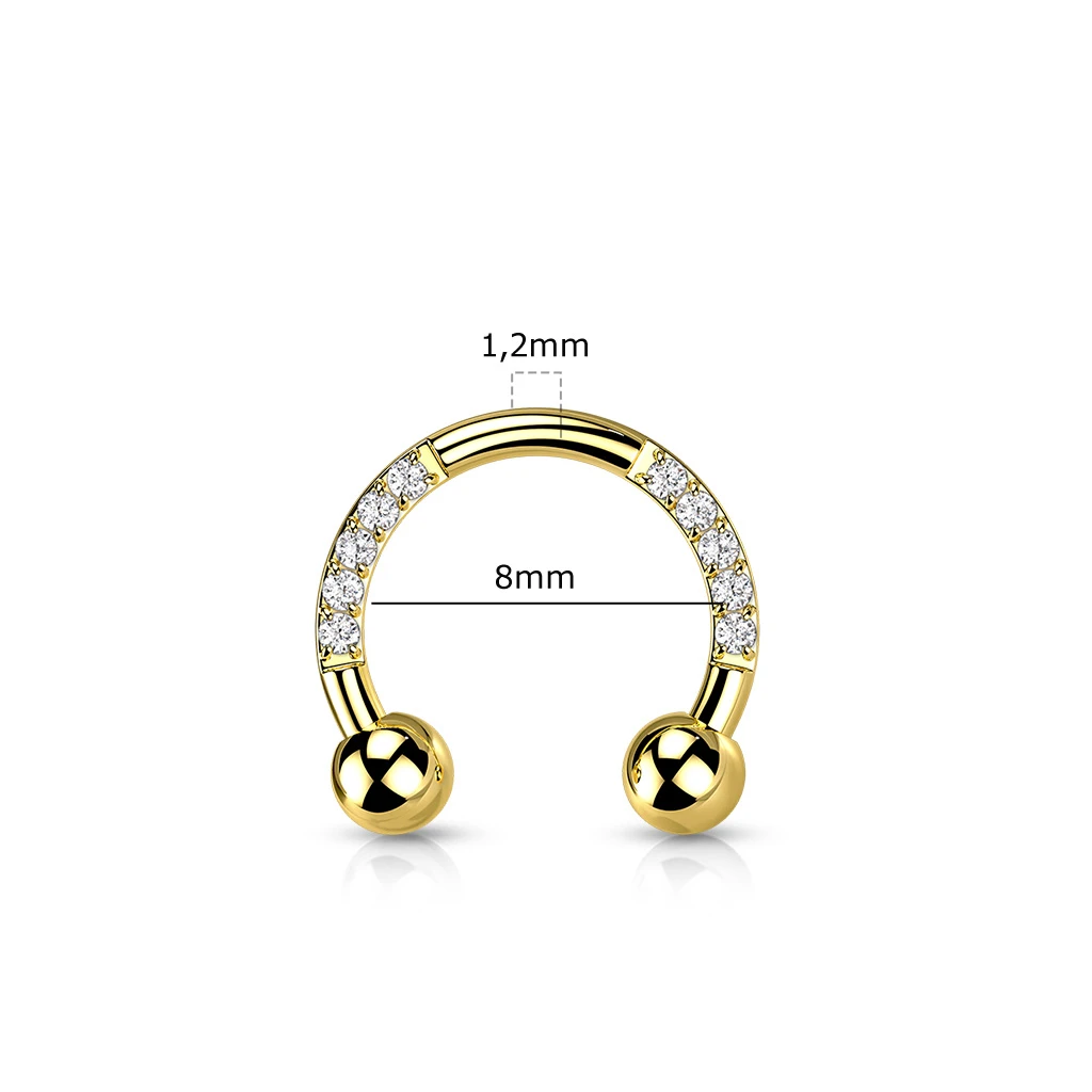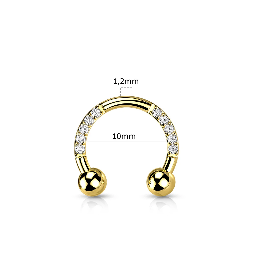 Titanový piercing do ucha se zirkony. Piercing je vyrobený z titanu s označením 6AL-4V-ELI ASTM F-136. Povrch piercingu je pozlacený technologií PVD. Kuličky mají průměr 3mm. Rozměry piercingu jsou zobrazené na podpůrné fotografii.