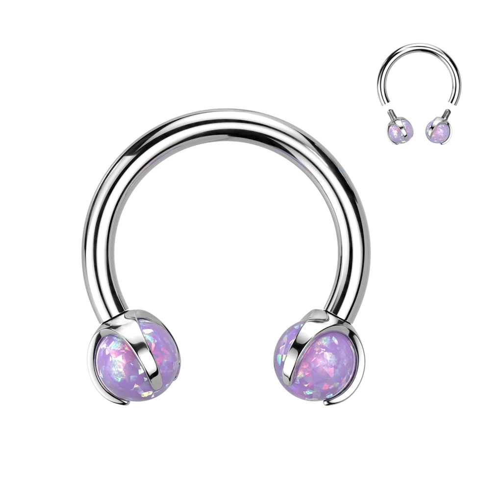 Titanový piercing do ucha s kuličkami z umělého opálu. Piercing je vyrobený z titanu s označením 6AL-4V-ELI ASTM F-136. Rozměry piercingu jsou zobrazené na podpůrné fotografii.
