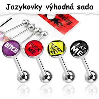 Sada piercingů jazyka. Sada obsahuje 4 kusy piercingu jazyka. Piercing je celý z chirurgické oceli 316l. Dřík piercingu je dlouhý 16mm s průměrem 1,6mm. Kulička má průměr 5mm. Průměr ozdoby 7mm.