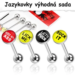 Sada piercingů jazyka. Sada obsahuje 4 kusy piercingu jazyka. Piercing je celý z chirurgické oceli 316l. Dřík piercingu je dlouhý 16mm s průměrem 1,6mm. Kulička má průměr 5mm. Průměr ozdoby 7mm.