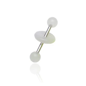 Piercing jazyka. Piercing má dřík vyrobený z chirurgické oceli 316L. Dřík piercingu má průměr 1,6mm, délku 16mm. Kuličky a položka jsou z plastu. Průměr kuliček 6mm, průměr podložky 11mm. Kuličky a podložka svítí ve tmě.