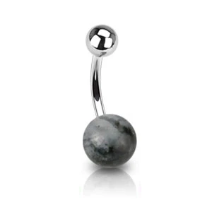 Piercing do pupíku. Piercing má dřík z chirurgické oceli 316L. Dřík piercingu má průměr 1,6mm, délku 10mm. Průměr horní kuličky z chirurgické oceli je 5mm, průměr dolní kuličky z bioplasmu je 8mm.