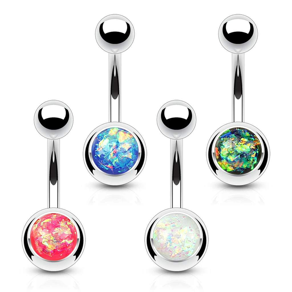 Sada piercingů do pupíku ozdobených syntetickým opálem. Sada obsahuje čtyři piercingy do břicha z chirurgické oceli. Horní šroubovací kulička má průměr 5mm, spodní kulička s opálem má průměr 8mm. Dřík piercingu je dlouhý 10mm, průměr dříku 1,6mm.