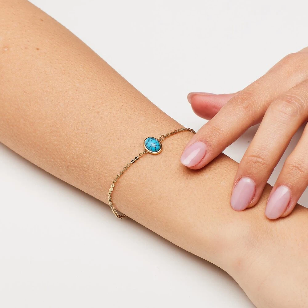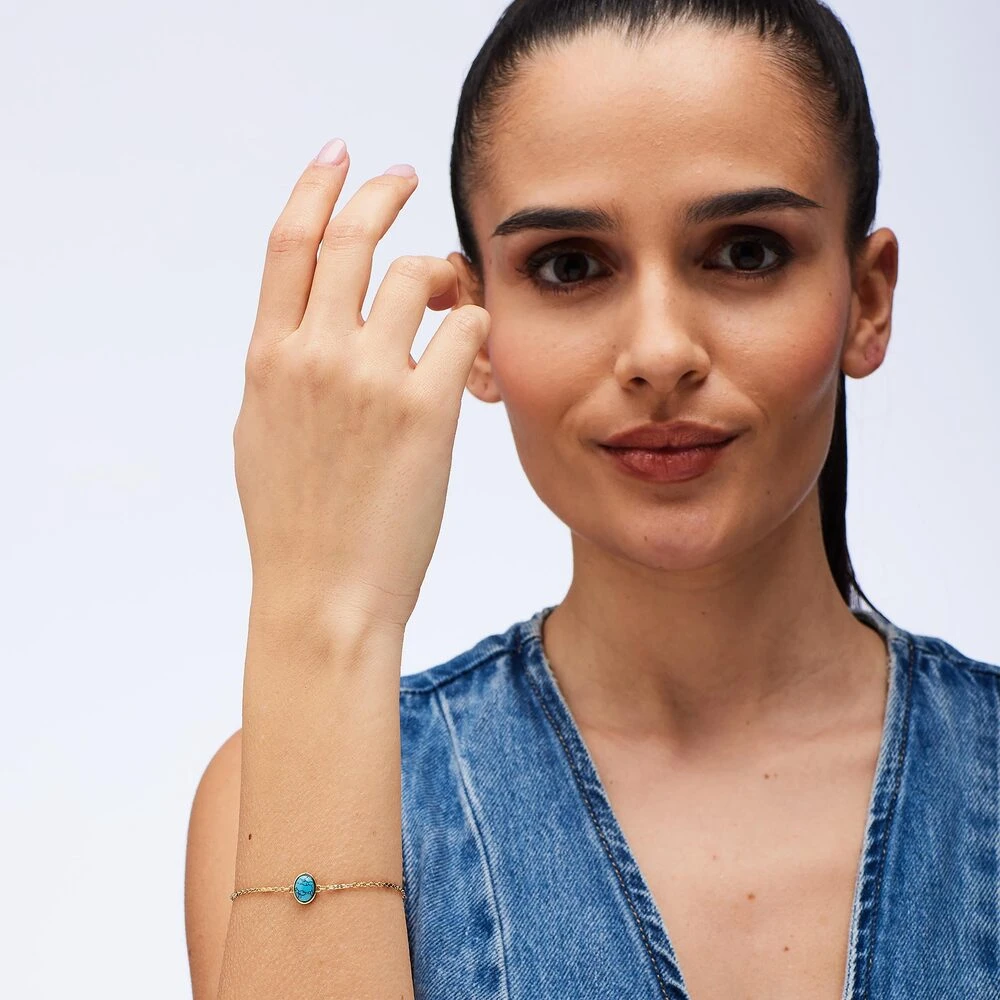 Náramek z chirurgické oceli s pozlaceným povrchem. Náramek je ozdobený rekonstituovaným tyrkysem. Zapínání náramku je karabinové. Elegantní dámský náramek s tyrkysem, který je považován za kámen ochrany, klidu a ženské síly.