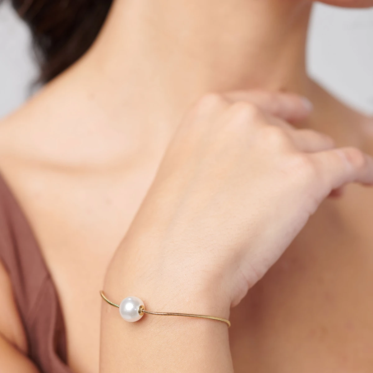 Dámský náramek z chirurgické oceli zdobený umělou perlou. Leštěný povrch náramku je pozlacený technologií PVD. Náramek je dlouhý 19cm. Zapínání náramku je karabinové.