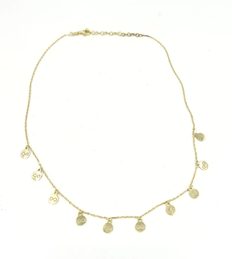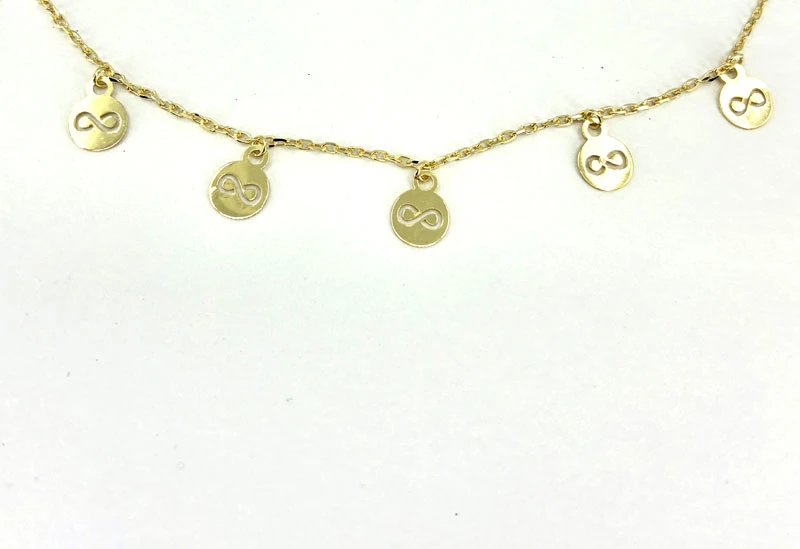 Náhrdelník ze stříbra ryzosti 925/1000. Povrch náhrdelníku je pozlacený žlutým 14k zlatem. Penízky se symbolem nekonečna mají průměr 6mm. Řetízkové části náhrdelníku mají průměr 1,0mm. Délku náhrdelníku lze nastavit v rozmezí 40-45cm.