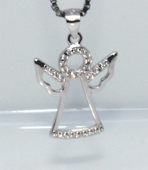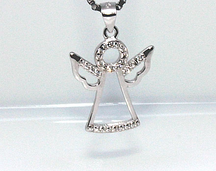 Stříbrný přívěšek s andělem. Přívěšek má porhodiovaný povrch. Rhodium dodává přívěsku jasnou barvu s leskem. Očkem na přívěsku lze provléct stříbrný řetízek s maximálním průměrem 3,0 mm. Rozměr přívěsku 20x14 mm.