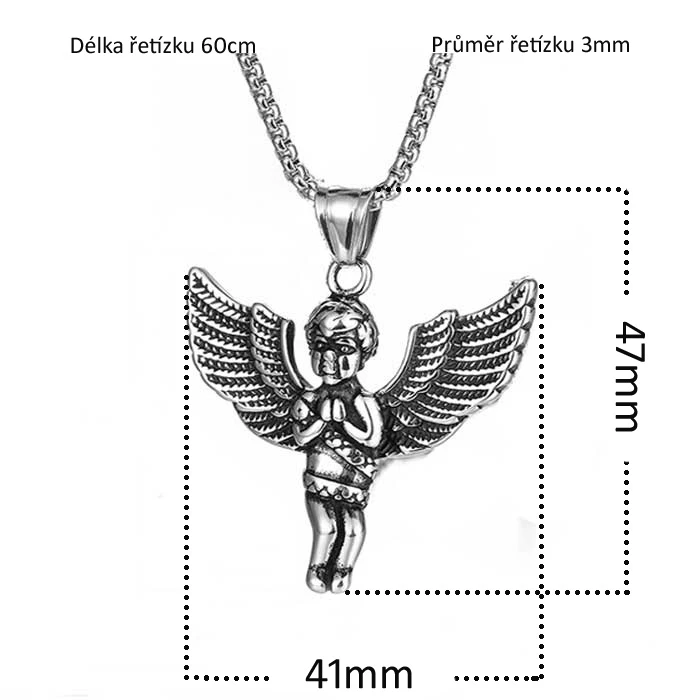 Přívěsek anděl z chirurgické oceli. K přívěsku náleží ocelový řetízek dlouhý 60cm. Průměr řetízku 3mm. Rozměr přívěsku anděla 41x47mm.