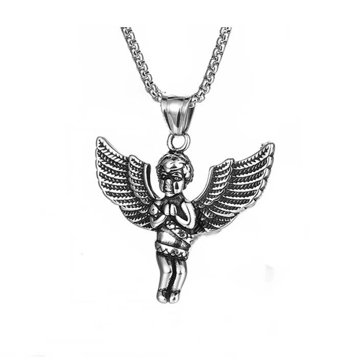 Náhrdelník z chirurgické oceli anděl. Náhrdelníky z chirurgické oceli, i ostatní ocelové šperky jsou stéle velice oblíbené v bezpočetných řadách jejich uživatelů především pro vlastnosti, která chirurgická ocel má. K vyzdvihovaným vlastnostem patří především nevyvolávání alergických reakcí, odolnost proti poškození, ocelové šperky neoxidují ani nemění barvu.