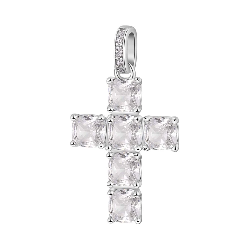 Stříbrný přívěsek křížek ozdobený prvotřídními zirkony. Přívěšek je vyrobený ze stříbra ryzosti 925/1000. Povrch přívěsku je porhodiovaný, úprava rhodiováním zvyšuje odolnost povrchu přívěsku proti poškození a zaručuje dlouhodobý bezchybný vzhled šperku.