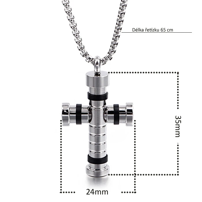 Přívěsek křížek a řetízek z chirurgické oceli. Šperky z chirurgické oceli se stále těší značné popularitě a jsou stále vyhledávanými módními doplňky. Tak jako všechny ocelové šperky je také tento náhrdelník odolní proti poškození, nevyvolává alergické reakce, neoxiduje a je barevně stálý.