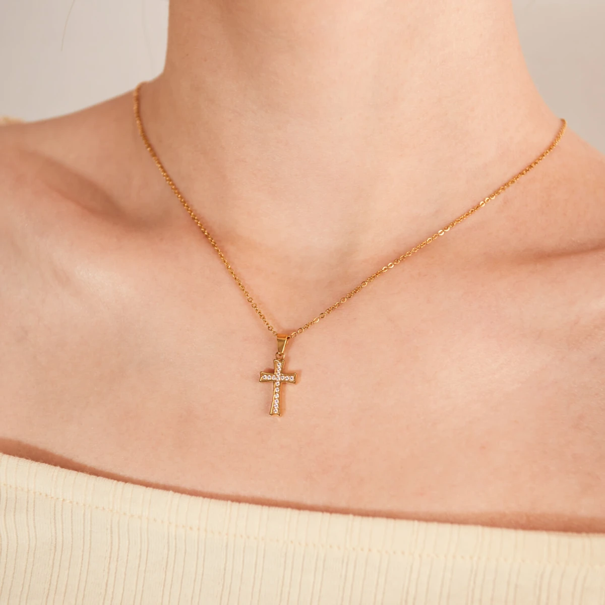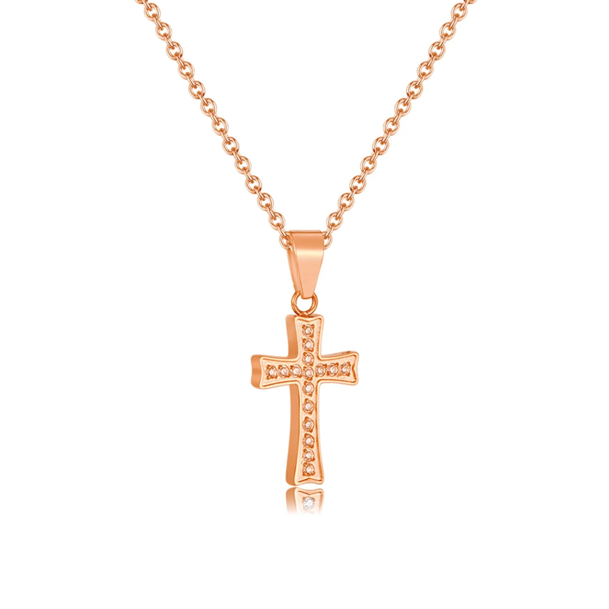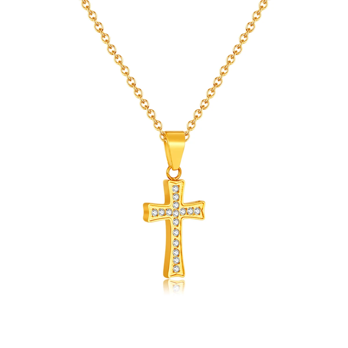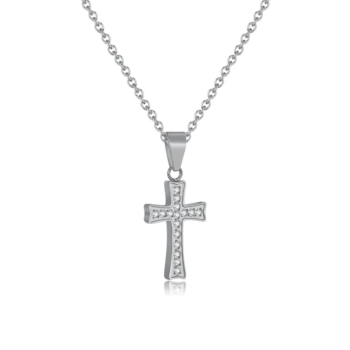 Náhrdelník z chirurgické oceli tvořený přívěskem křížek a jemným řetízkem. Povrch řetízku je leštěný. Přívěšek křížek má leštěný povrch a je osazený čirými zirkony. Rozměr křížku: výška včetně závěsného očka 22mm, šířka 10mm. Délku ocelového řetízku lze nastavit v rozmezí 45-50cm, průměr řetízku 1,2mm.