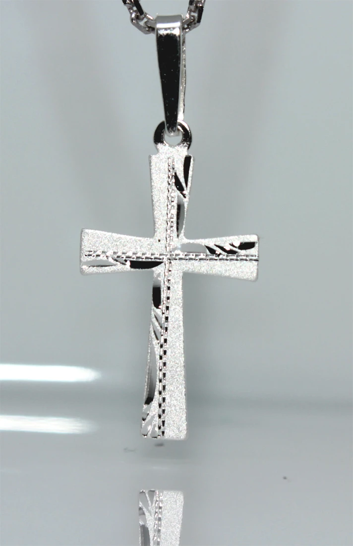 Stříbrný křížek na krk. Křížek vyrobený ze stříbra 925/000. Povrch křížku je zdobený rytinou. Rozměr přívěsku 21x12 mm. Závěsným očkem na křížku lze provléct stříbrný řetízek s průměrem do 1,5 mm.
