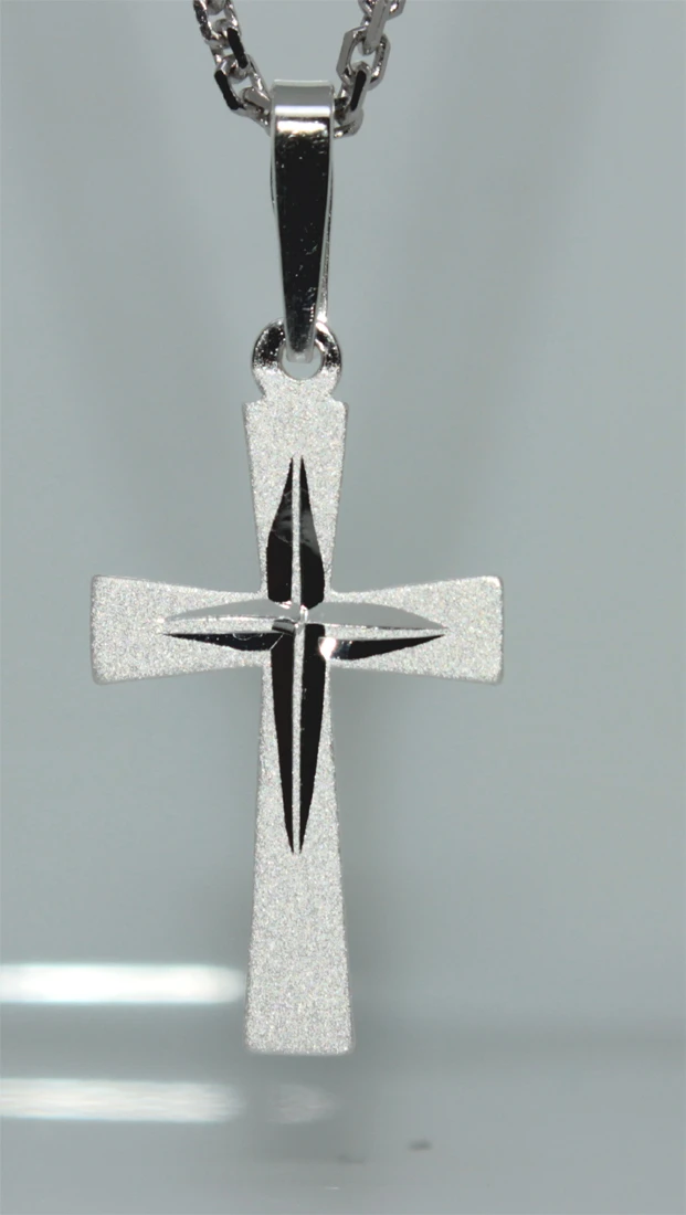 Stříbrný křížek na krk. Křížek vyrobený ze stříbra 925/000. Povrch křížku je zdobený rytinou. Rozměr přívěsku 21x12 mm. Závěsným očkem na křížku lze provléct stříbrný řetízek s průměrem do 1,5 mm.