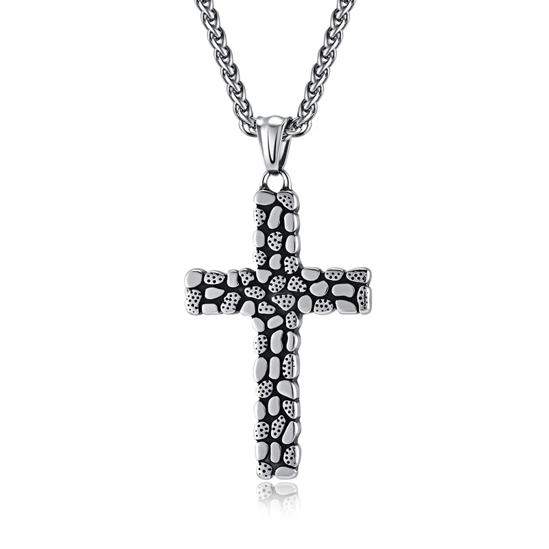 Přívěsek z chirurgické oceli křížek s ocelovým řetízkem. Povrch křížku je se vzorem a kombinuje lesk s černou. Řetízek o průměru 3mm je dlouhý 60cm, výška křížku včetně závěsného oka 62mm, šířka 33mm.