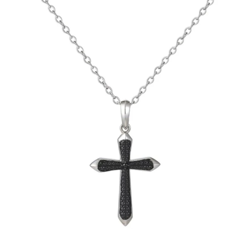 Přívěsek z chirurgické oceli křížek a řetízek představující nadčasové spojení v náhrdelník. Povrch křížku je leštěný, pohledová strana přívěsku je upravená černou PVD barvou a osazená černými zirkony. Rozměr křížku 39x26mm. Ocelový řetízek má očka široká 2,6mm, délka řetízku 55cm. Zapínání řetízku je karabinové.