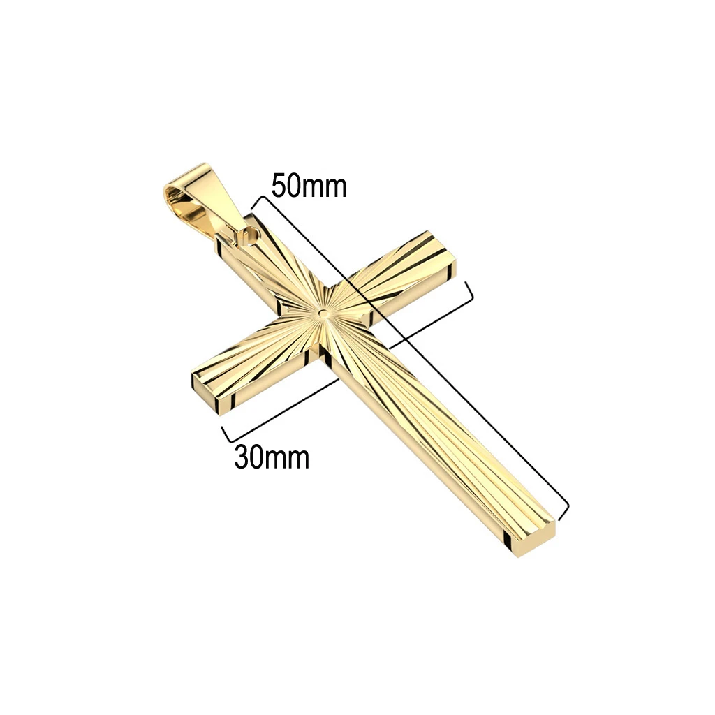 Ocelový přívěsek křížek. Povrch křížku je leštěný s vygravírovanými paprsky světla. K přívěsku náleží ocelový řetízek vzoru ankr široký 3mm, dlouhý 60cm. Rozměr kříže:50x30mm.