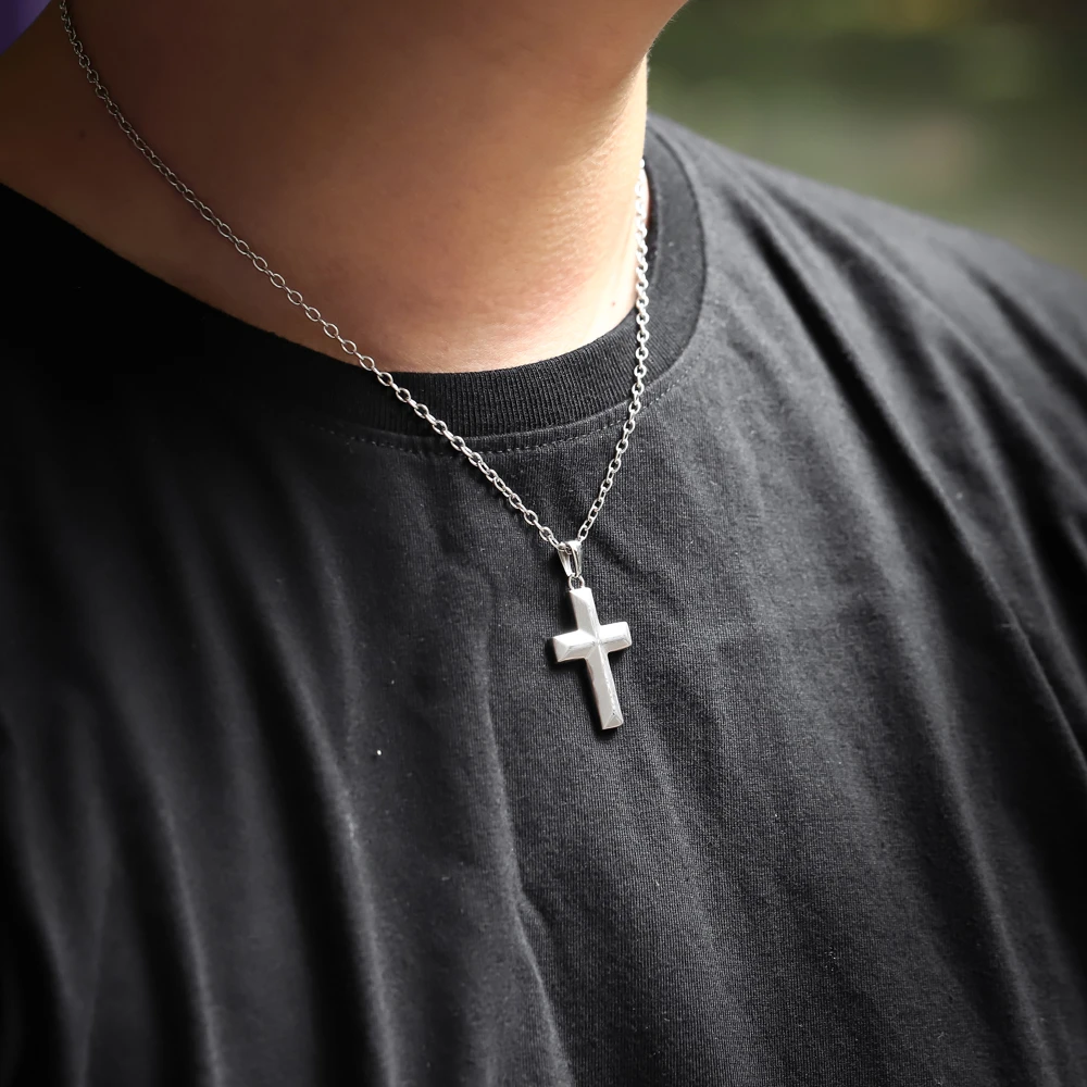 Přívěsek na řetízek křížek z damascénské oceli. Křížek má díky použité technologii známé po staletí krásnou kresbu po celém povrchu, způsobenou spojováním vrstev při teplotě 1400°C. Rozměr křížku 31x20mm, Závěsným očkem na přívěsku lze provléct řetízek s maximálním průměrem 3mm. Ke křížku náleží řetízek z chirurgické oceli dlouhý 55cm o průměru 2,5mm.
