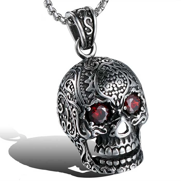 Přívěsek a řetízek z chirurgické oceli. Přívěšek lebka má plastický povrch se vzorem. Oční důlky lebky jsou osazené rudými krystaly, které při dopadu světla září. Rozměr lebky 35x23mm. Řetízek z chirurgické oceli je dlouhý 60cm, šířka ocelového řetízku vzoru pancr 3mm.