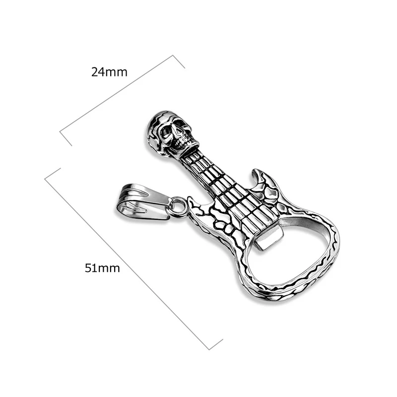 Přívěsek z chirurgické oceli otvírák ve tvaru kytary. Místo hlavy s ladícími kolíky je lebka. K přívěsku obdržíte řetízek vzor ankr dlouhý 60cm. Rozměr přívěsku 24x51mm najdete zobrazený na podpůrné fotografii.