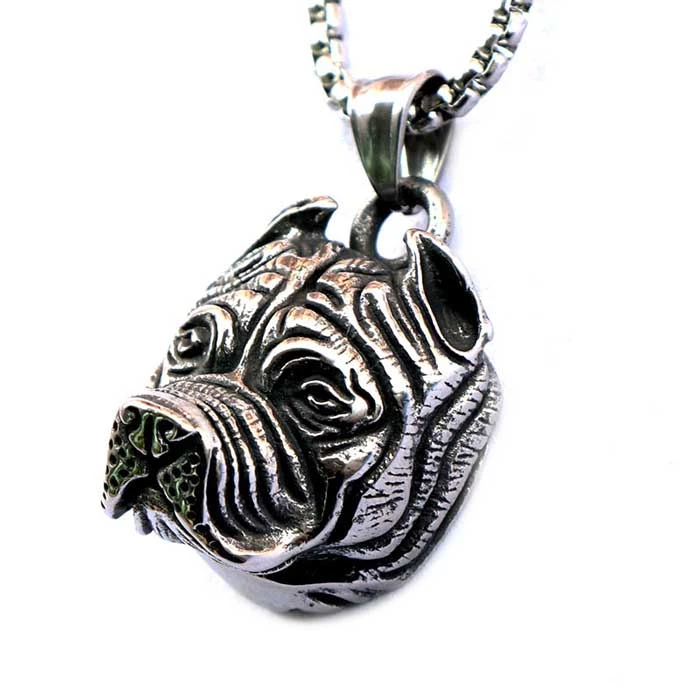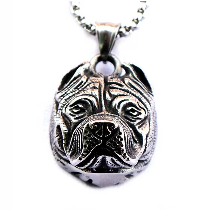 Přívěsek z chirurgické oceli hlava psa typu bull. Rozměr hlavy 31x23x20mm. K přívěsku patří řetízek z chirurgické oceli dlouhý 60cm. Průměr ocelového řetízku 3mm.