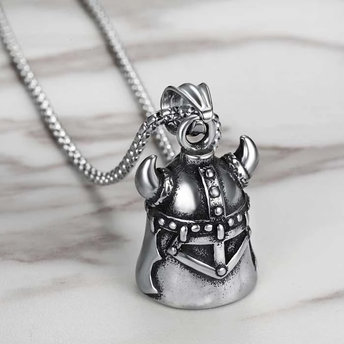 Přívěsek pro motorkáře zvoneček pro štěstí s rohy. K přívěsku náleží ocelový řetízek s průměrem 3mm, dlouhý 60cm. Rozměr zvonečku 22x35mm.