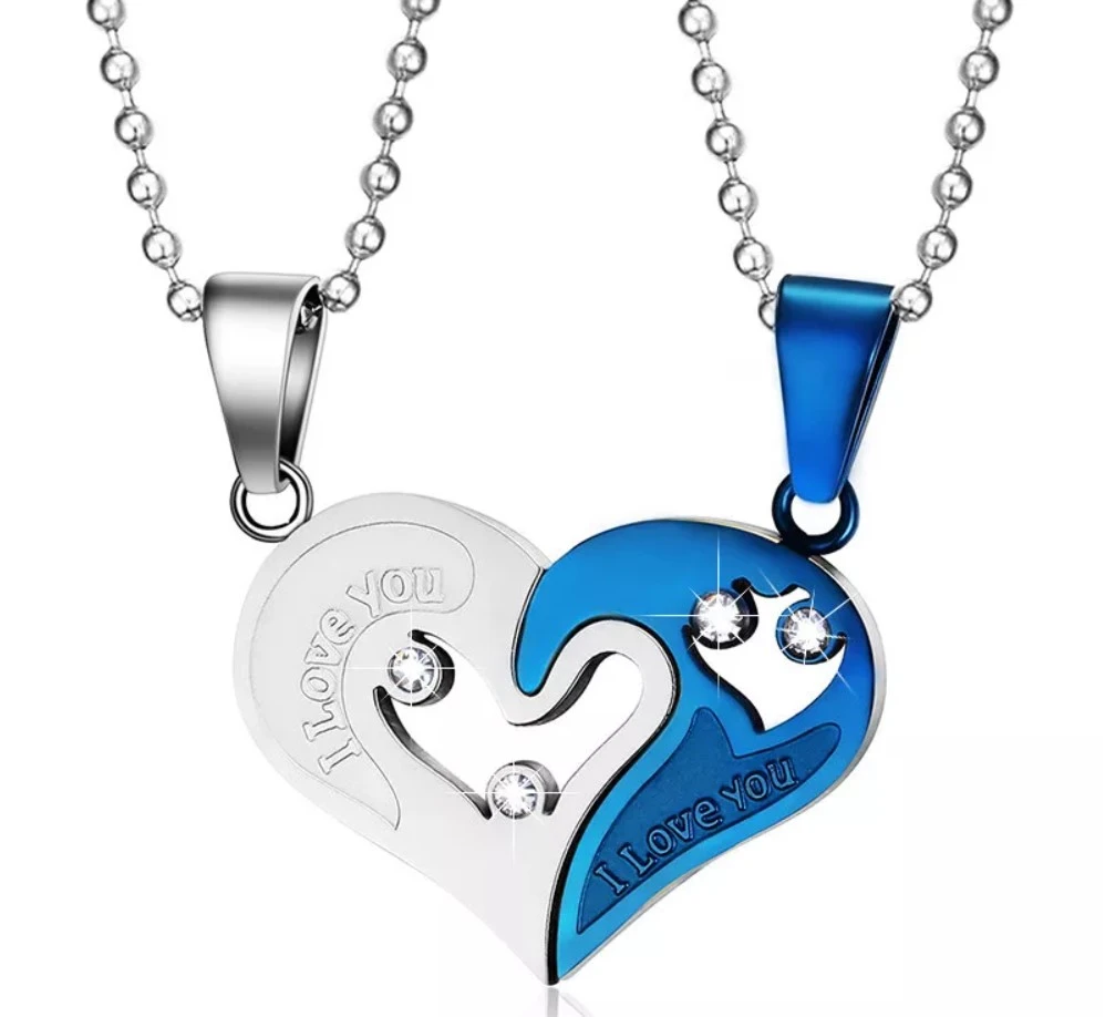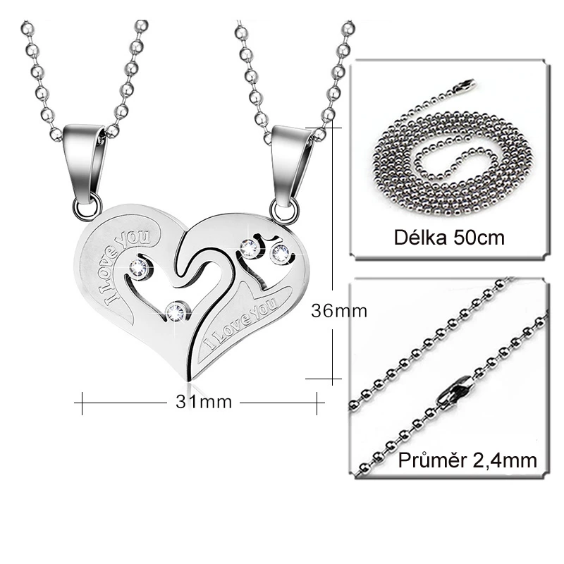 Přívěsek z chirurgické oceli srdíčko pro dva. Přívěsek tvoří dvě poloviny srdce. Na každé polovině srdce je nápis "I love you" a dva zirkony. Povrch přívěsku je kombinace mat/lesk. Ke každé polovině srdíčka náleží ocelový řetízek dlouhý 50cm s průměrem 2,4mm.