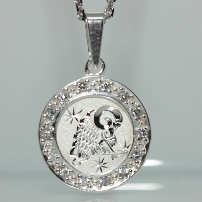 Stříbrný přívěsek se znamením Berana (21.3-20.4). Průměr přívěsku 16 mm. Očkem na přívěsku lze protáhnout stříbrný řetízek s průměrem do 1,5 mm. Vyryté znamení je dokola ozdobené zirkony.