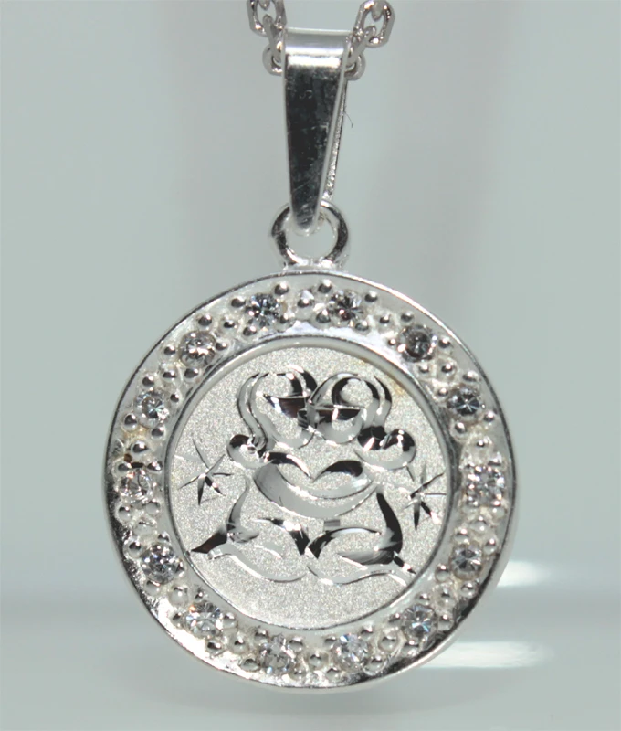 Stříbrný přívěsek se znamením Blíženců (21.5-21.6). Průměr přívěsku 16 mm. Očkem na přívěsku lze protáhnout stříbrný řetízek s průměrem do 1,5 mm. Vyryté znamení je dokola ozdobené zirkony.