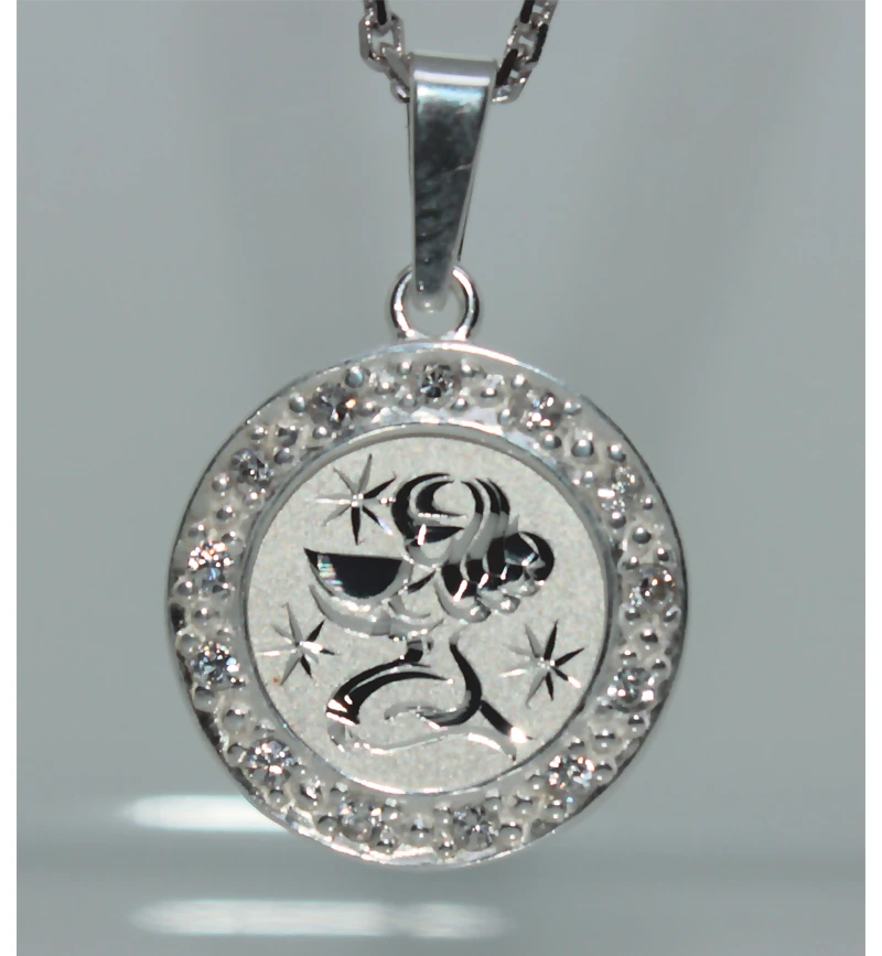 Stříbrný přívěsek se znamením Panny (24.8-23.9). Průměr přívěsku 16 mm. Očkem na přívěsku lze protáhnout stříbrný řetízek s průměrem do 1,5 mm. Vyryté znamení je dokola ozdobené zirkony.