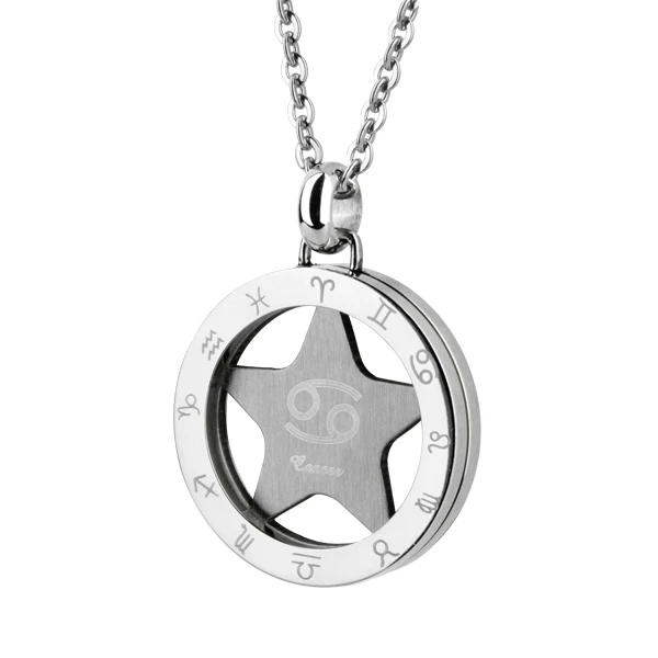 Přívěsek z chirurgické oceli se znamením Rak (22.6 - 23.7). Znamení Raka je umístěné do středu matné hvězdy, která se otáčí v leštěném orámování, na kterém jsou zobrazené symboly všech znamení horoskopu. Průměr přívěsku 25mm.