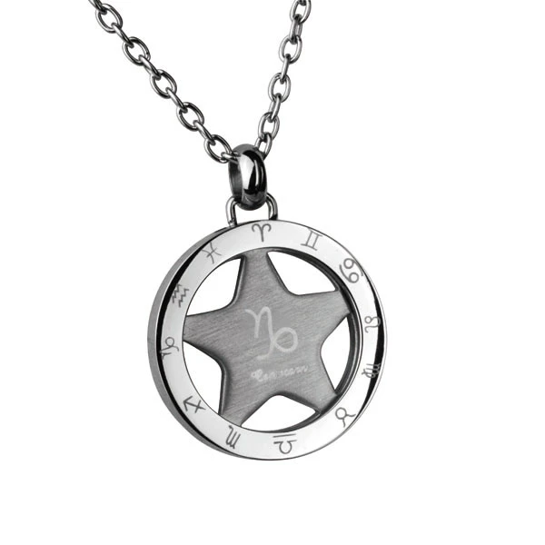 Přívěsek z chirurgické oceli se znamením Kozoroh (22.12 - 20.1). Znamení je umístěné do středu matné hvězdy, která se otáčí v leštěném orámování, na kterém jsou zobrazené symboly všech znamení horoskopu. Průměr přívěsku 25mm.