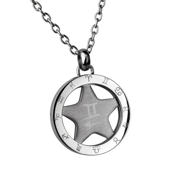 Přívěsek z chirurgické oceli se znamením Blíženci (22.5 - 21.6). Znamení je umístěné do středu matné hvězdy, která se otáčí v leštěném orámování, na kterém jsou zobrazené symboly všech znamení horoskopu. Průměr přívěsku 25mm.