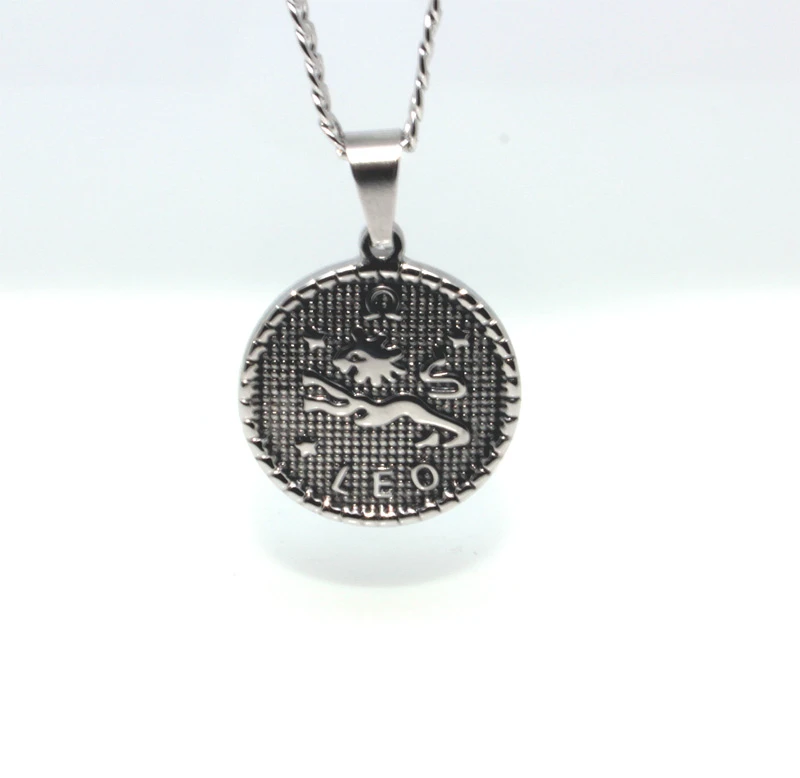 Přívěsek z chirurgické oceli se znamením Lev (23. července – 22. srpna). Znamení Lva je plastické na černo-stříbrném podkladě. Průměr přívěsku 25mm. K přívěsku se znamením náleží řetízek z chirurgické oceli dlouhý 60cm.