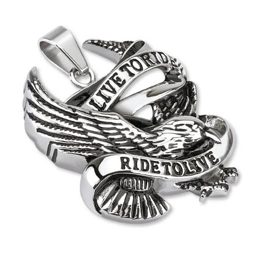 Přívěsek z chirurgické oceli 316l. Rozměr přívěsku 40*30mm. Krásný ocelový orel s nápisem „Žiji proto abych jezdil, jezdím proto abych žil“. Závěsným očkem je možné protáhnout ocelový řetízek s průměrem do 4mm.