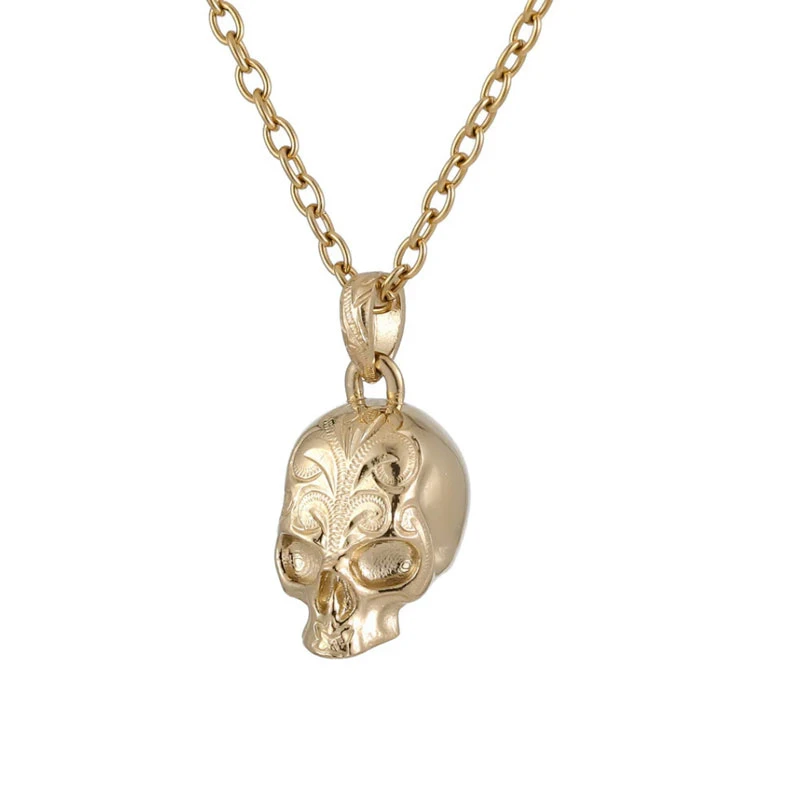 Přívěsek lebka z chirurgické oceli. Povrch lebky je leštěný ozdobený rytým vzorem. K přívěsku náleží řetízek z chirurgické oceli vzoru ankr s průměrem 2,5 mm, dlouhý 55 cm. Rozměr lebky 18 x 15 x 12 mm.