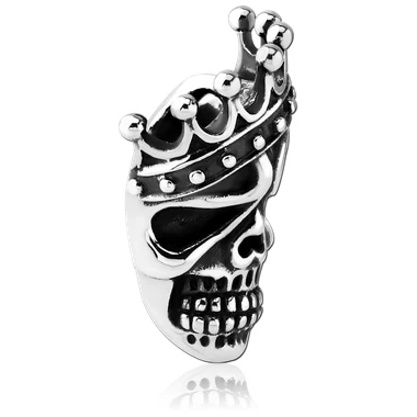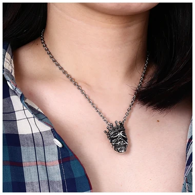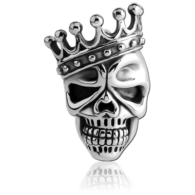 Přívěsek lebka s korunou zhotovený z chirurgické oceli. Povrch přívěsku je leštěný s černěnými detaily. Rozměr přívěšku 36x23x14 mm. Přívěsek lze zavěsit na ocelový řetízek s maximálním průměrem 5 mm.