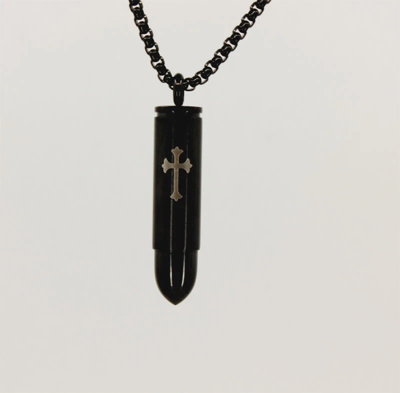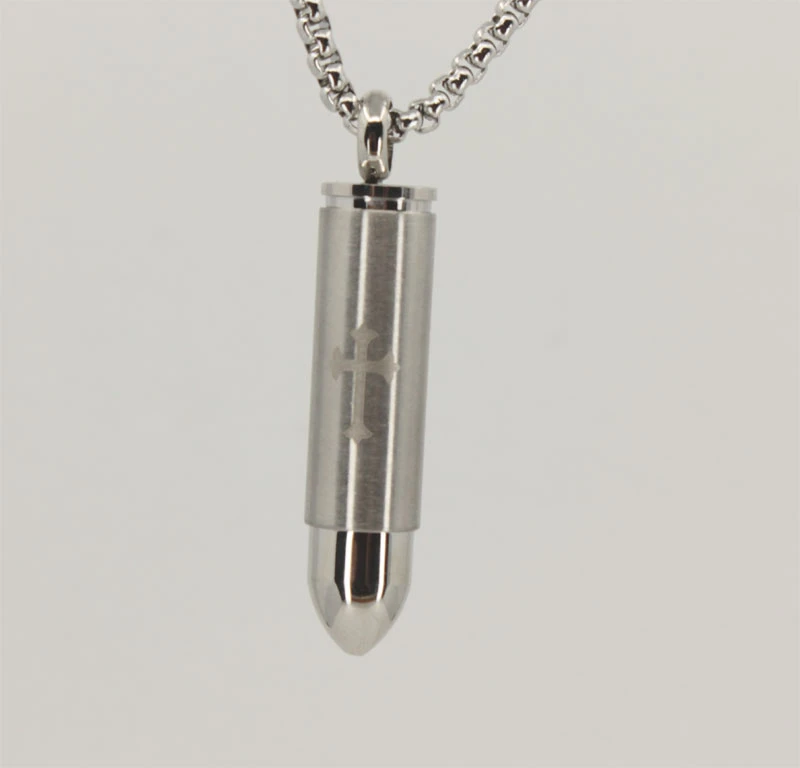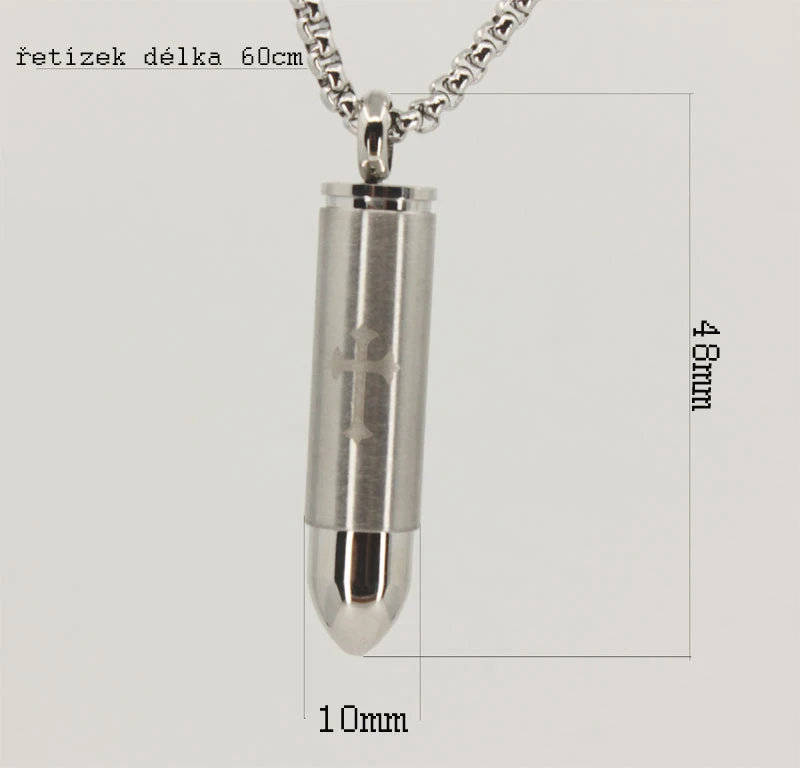 Přívěsek na řetízek z chirurgické patrona, povrch nábojnice je matný s ozdobou křížku, povrch projektilu je leštěný. Spodní část nábojnice s okem lze odšroubovat. Průměr nábojnice: 10mm, délka: 48mm . Očkem lze protáhnout řetízek s průměrem do 5mm.