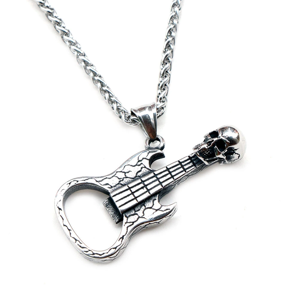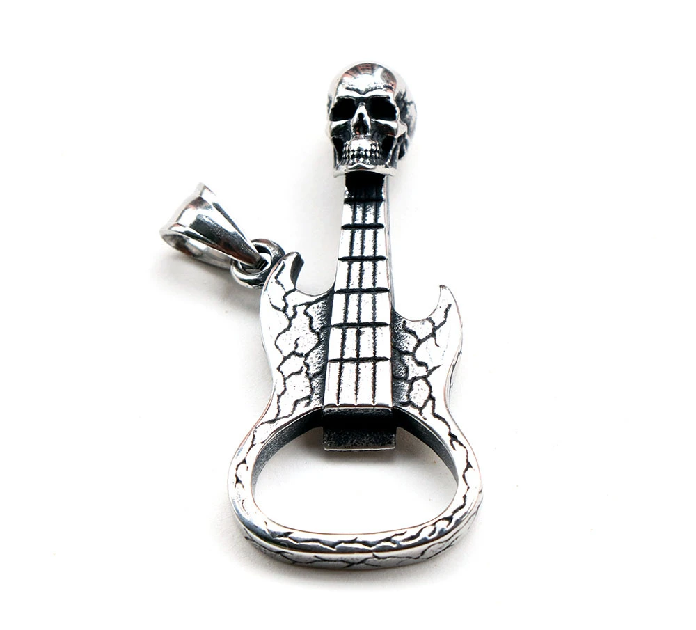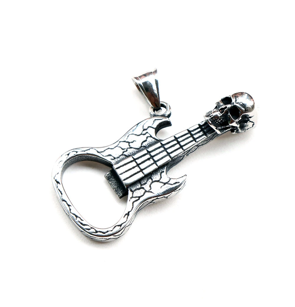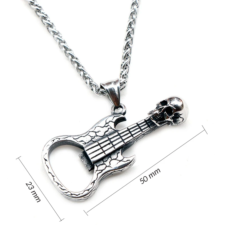 Přívěsek ve tvaru kytary z chirurgické oceli. K přívěsku náleží ocelový řetízek vzoru ankr dlouhý 60cm. Přívěsek lze používat jako otvírák. Rozměr přívěsku 50 x 23 mm.
