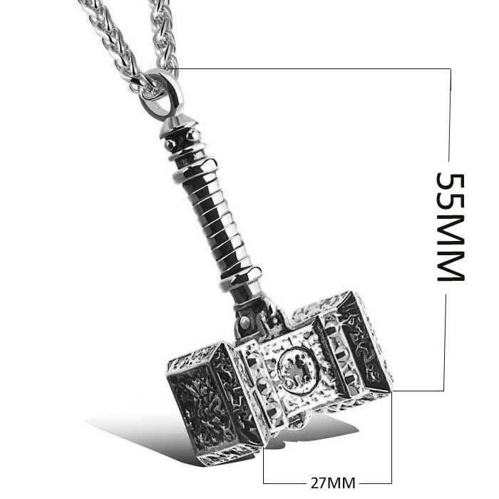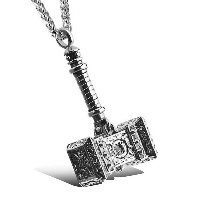 Ocelový přívěsek Thórovo kladivo s řetízkem dlouhým 60 cm. Rozměr přívěsku 55x27mm. Povrch Thorova kladiva je zdobený plastikami s černou patinou.