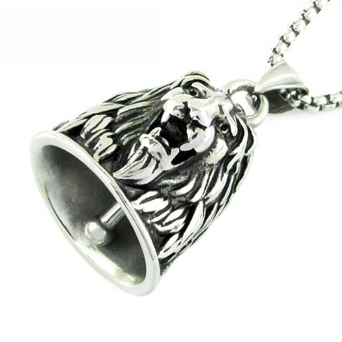 Přívěsek pro motorkáře zvoneček pro štěstí s plastikou lví hlavy. K přívěsku náleží ocelový řetízek s průměrem 3mm, dlouhý 60cm. Rozměr zvonečku 22x34mm.