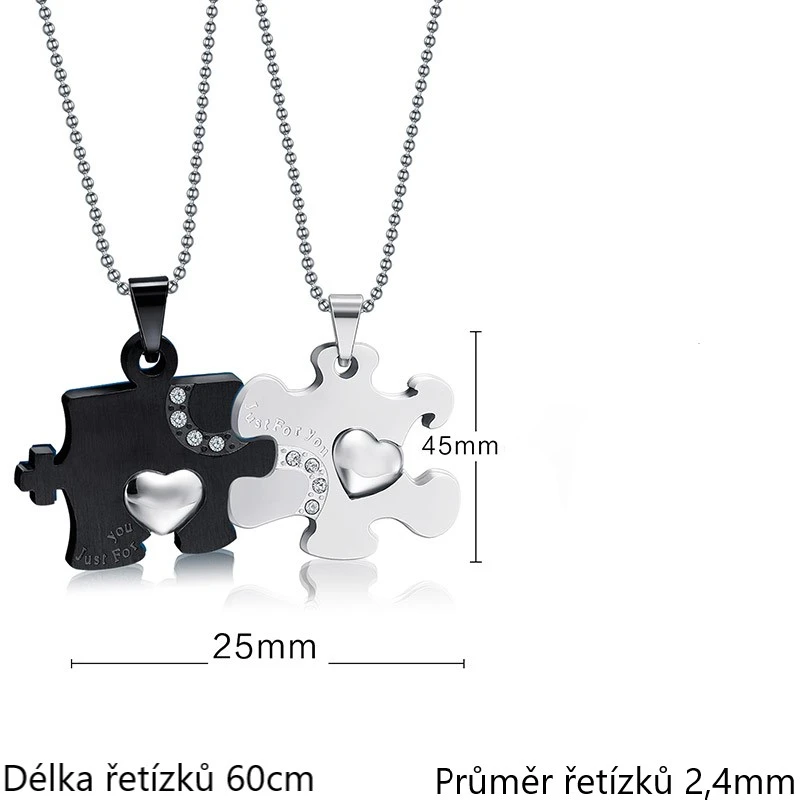 Přívěsky na krk pro pár. Přívěsky do sebe zapadají a tvoří tak nerozlučný celek - puzzle skládačku on & ona. K přívěskům náleží ocelové řetízky dlouhé 60cm, průměr řetízků 2,4mm. Řetízky je možné na přání zkrátit.