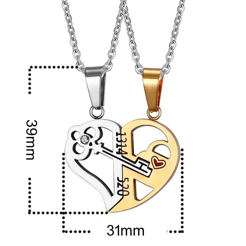 Přívěsky na krk pro pár. Přívěsky do sebe zapadají a tvoří tak nerozlučný celek - přívěšek 1/2 srdce se zlatým povrchem a 1/2 srdce s klíčkem ozdobená zirkonem. K přívěskům náleží ocelové řetízky s karabinovým zapínáním dlouhé 50cm, průměr řetízků 1,8mm.