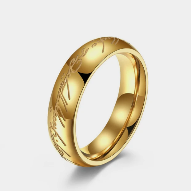 Ocelový prsten moci s rytým textem na vnější straně prstenu.