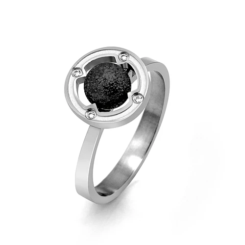 Prsten z chirurgické oceli 316l. Obroučka je z pohledové strany matná, boky jsou leštěné, ozdoba má pohledovou stranu matnou, boky leštěné. Černá kulička s pískovaným povrchem má průměr 6mm, průměr celé ozdoby 10,5mm. Šířka obroučky 2,8mm. Elegantní dámský prsten z chirurgické oceli.