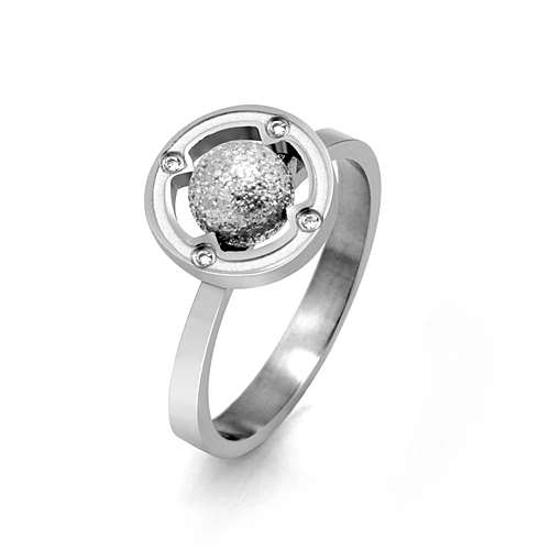 Prsten z chirurgické oceli 316l. Obroučka je z pohledové strany matná, boky jsou leštěné, ozdoba má pohledovou stranu matnou, boky leštěné. Kulička s pískovaným povrchem má průměr 6mm, průměr celé ozdoby 10,5mm. Šířka obroučky 2,8mm. Elegantní dámský prsten z chirurgické oceli.